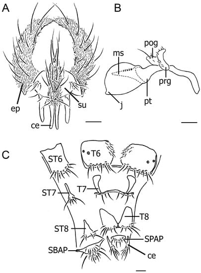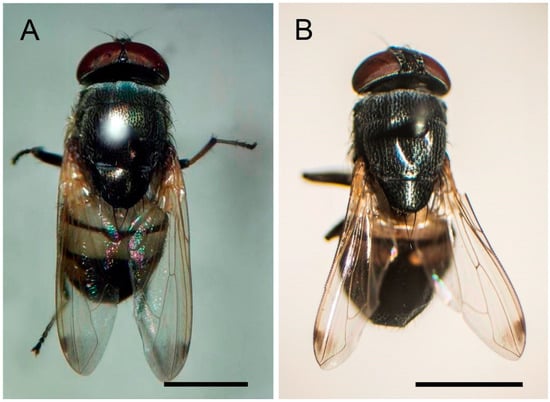 - Bernhard, M.; Haenni, J.P. Morphology and terminology of adult Diptera (other than terminalia). In Contributions to a Manual of Palaearctic Diptera. General and Applied Dipterology; László, P., Béla, D., Eds.; Science Herald: Budapest, Hungary, 2000; pp. 22–51. [Google Scholar]