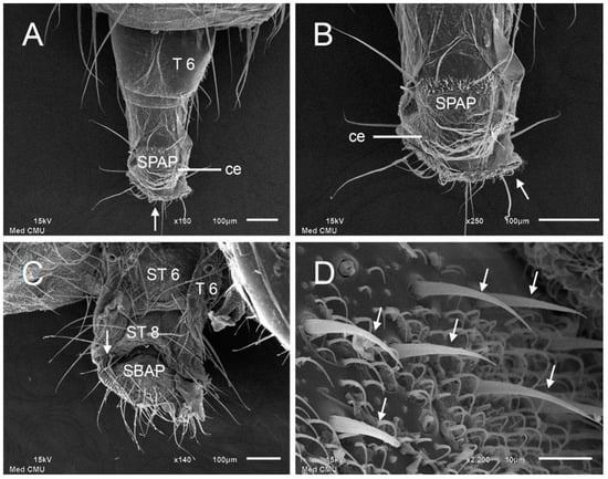 - Rossignol, P.A.; McIver, S.B. Fine structure and role in behavior of sensilla on the terminalia of Aedes aegypti (L.) (Diptera: Culicidae). J. Morphol. 1977, 151, 419–437. [Google Scholar] [CrossRef] [PubMed]