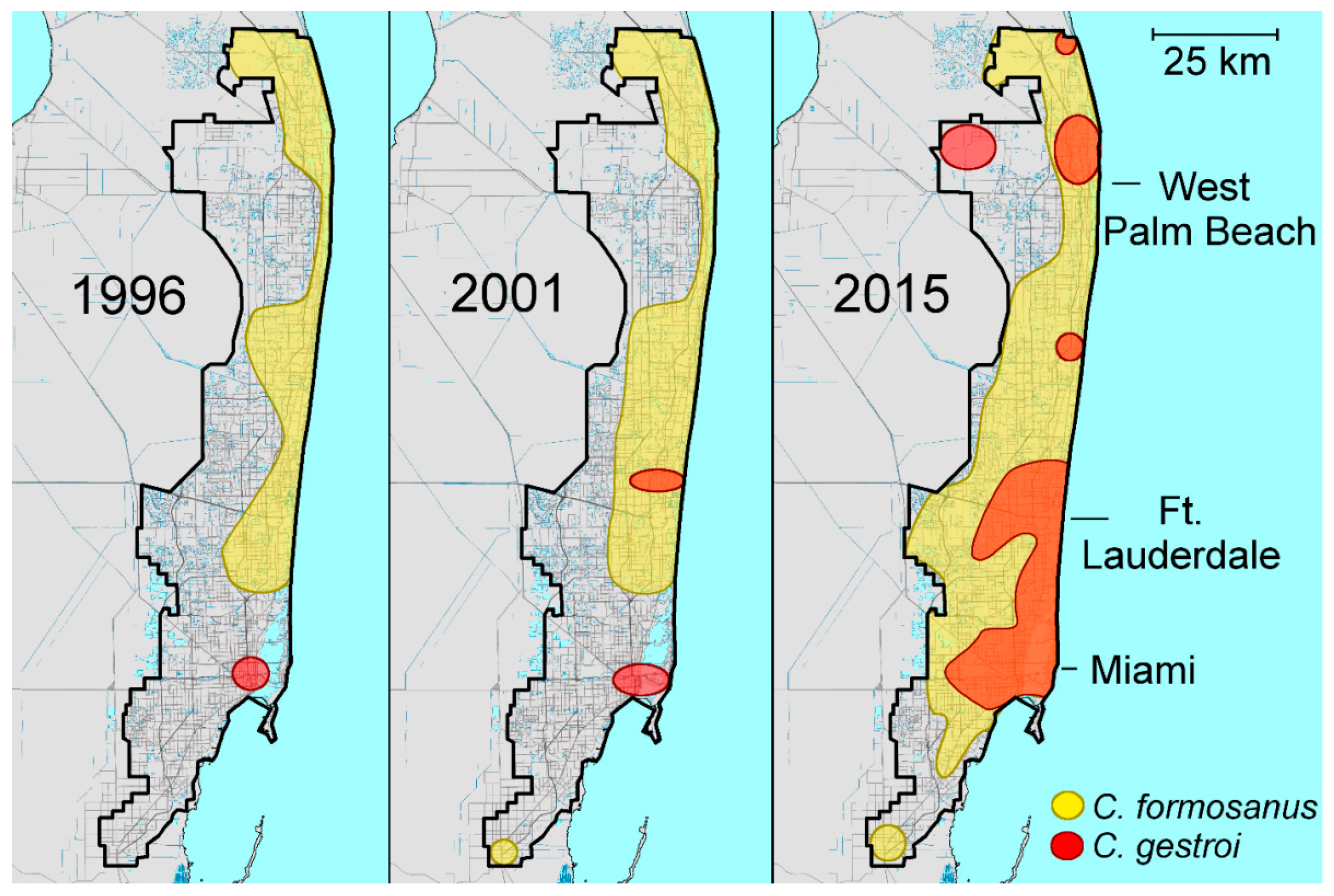 - Chouvenc, T.; Scheffrahn, R.H.; Su, N.-Y. Establishment and spread of two invasive subterranean termite species (C. formosanus and C. gestroi; Isoptera; Rhinotermitidae) in metropolitan southeastern Florida (1990–2015). Fla. Entomol. 2016, 99, 187–191. [Google Scholar] [CrossRef]