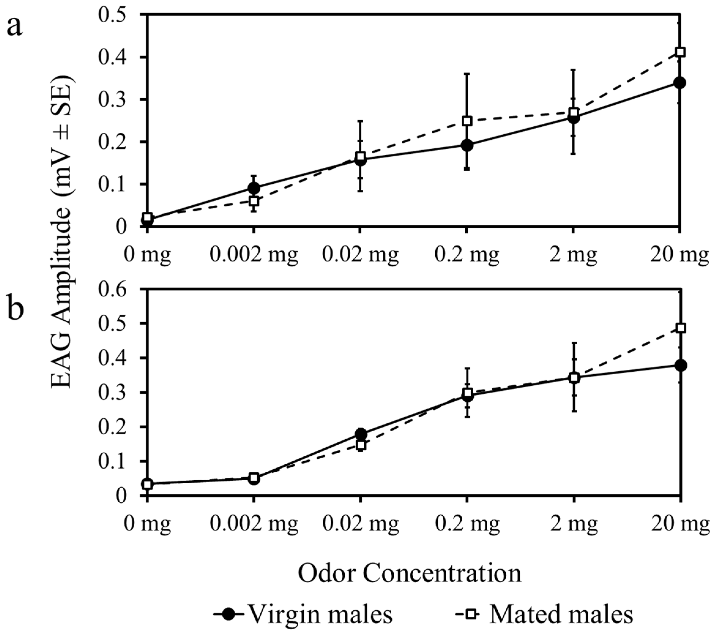 There were no differences in EAG response amplitude to whole body extracts (F5,180 = 0.81, p = 0.36) (Figure 3a) or linalool (F5,180 = 0.42, p = 0.21) (Figure 3b) among mated and virgin males. Response amplitude increased in virgin and mated male psyllids as the concentration of each odor was increased (Figure 3).