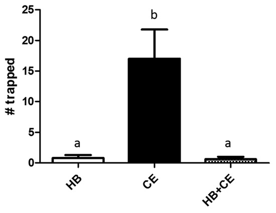 Effects of heptyl butyrate on the attractiveness of chicken extract in traps. Yellowjacket traps containing either heptyl butyrate (HB), chicken extract (CE), or a combination of the two (HB + CE) were hung together for 3 h. The number of yellowjackets trapped by each was then counted. The experiment was independently replicated at five different locations, and bars represent the mean ± SEM. Data from replicates were pooled for analysis by one-way repeated measures ANOVA followed by Newman-Keuls post-test. Differences were deemed statistically significant when p < 0.05, and are indicated by letters in the graph (same letters = no difference).