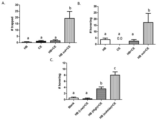 Partitioning of heptyl butyrate and chicken extract results in increased trapping. Traps containing heptyl butyrate (HB), chicken extract (CE), or a combination of both inside (HB + CE) were compared against traps containing CE inside and HB outside. Traps were hung at separate locations for 3 h, and the number of yellowjackets caught (A) or hovering around the trap (B) were counted. In (C), traps containing CE inside with low (5 μL) or high (50 μL) doses of HB inside, or HB on the outside (50 μL) were hung at separate locations for 3 h, and the number of yellowjackets hovering in the vicinity were counted. Experiments were independently replicated at four to six different locations, and bars represent the mean ± SEM. Data from replicates were pooled for analysis by one-way repeated measures ANOVA followed by Newman–Keuls post-test. Differences were deemed statistically significant when p < 0.05, and are indicated by letters in the graph (same letters = no difference).