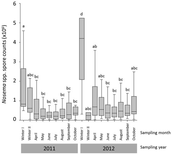 Nosema spp. intensities of all infected colonies (N = 420) per sampling month (N = 3 to 46) over the entire study period. Samples were taken monthly from April to October and once or twice during winter (Winter I and Winter II samples). Nosema spp. intensities were compared using Kruskal–Wallis ANOVA and Bonferroni multi comparison tests. Significant differences (p < 0.05) are indicated by different letters (a,b,c,d). Boxplots show inter-quartile range (block), Median (black line within box) and data range (vertical lines).