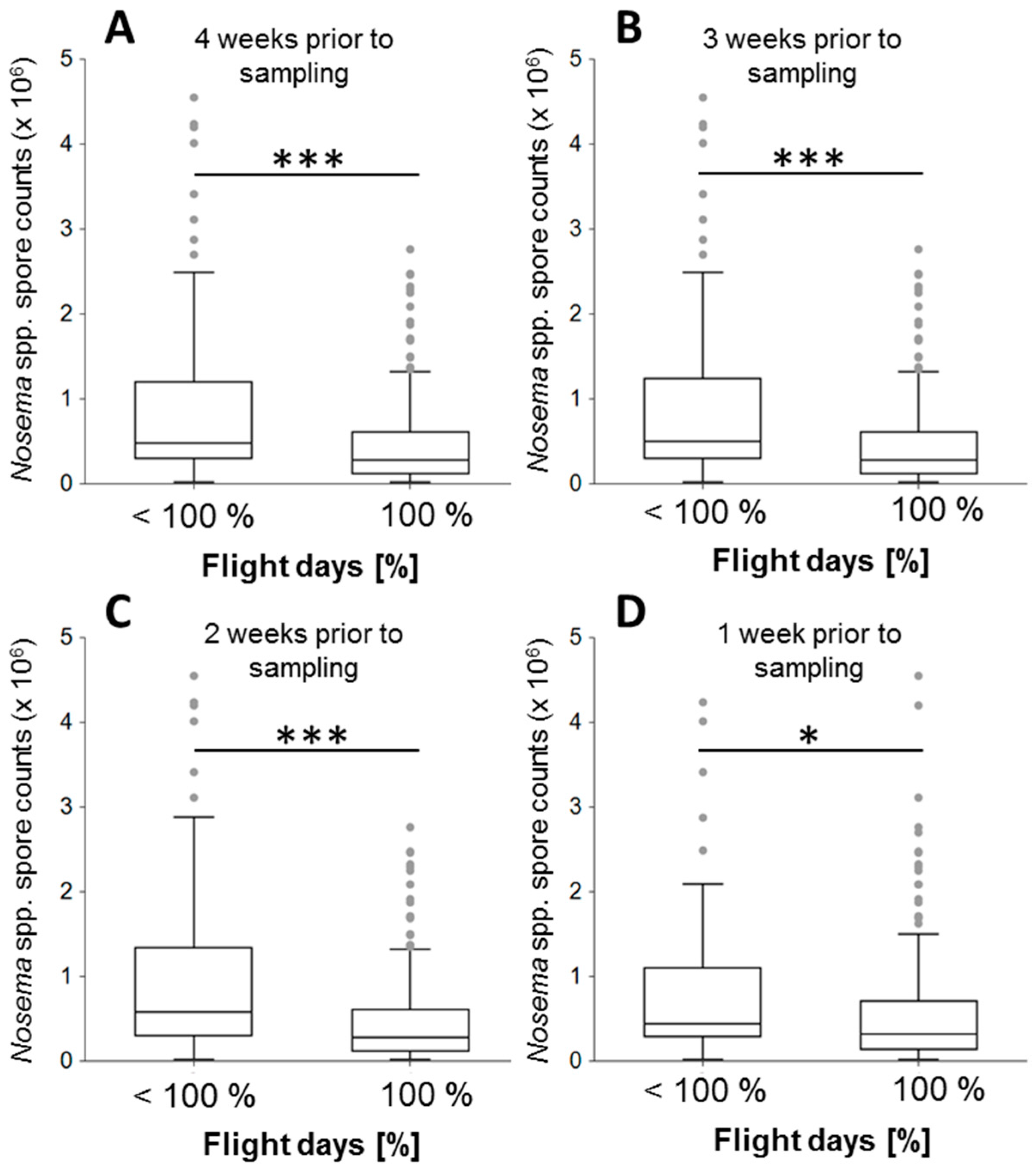 Nosema spp. intensities and the proportion of days enabling honey bee flight (>10 °C) in two categories: Colonies that had less than 100% of flight days are compared to colonies that had 100% of flight days and are separately displayed as boxplots for four (A); three (B); two (C) and one (D) week prior to the sampling. For each time period, Nosema spp. intensities were significantly higher in the group with less than 100% of flight days (Wilcoxon rank sum tests, *** = p < 0.001, * = p < 0.05). Boxplots show inter-quartile range (block), Median (black line within box), data range (vertical lines) and outliers (grey dots).