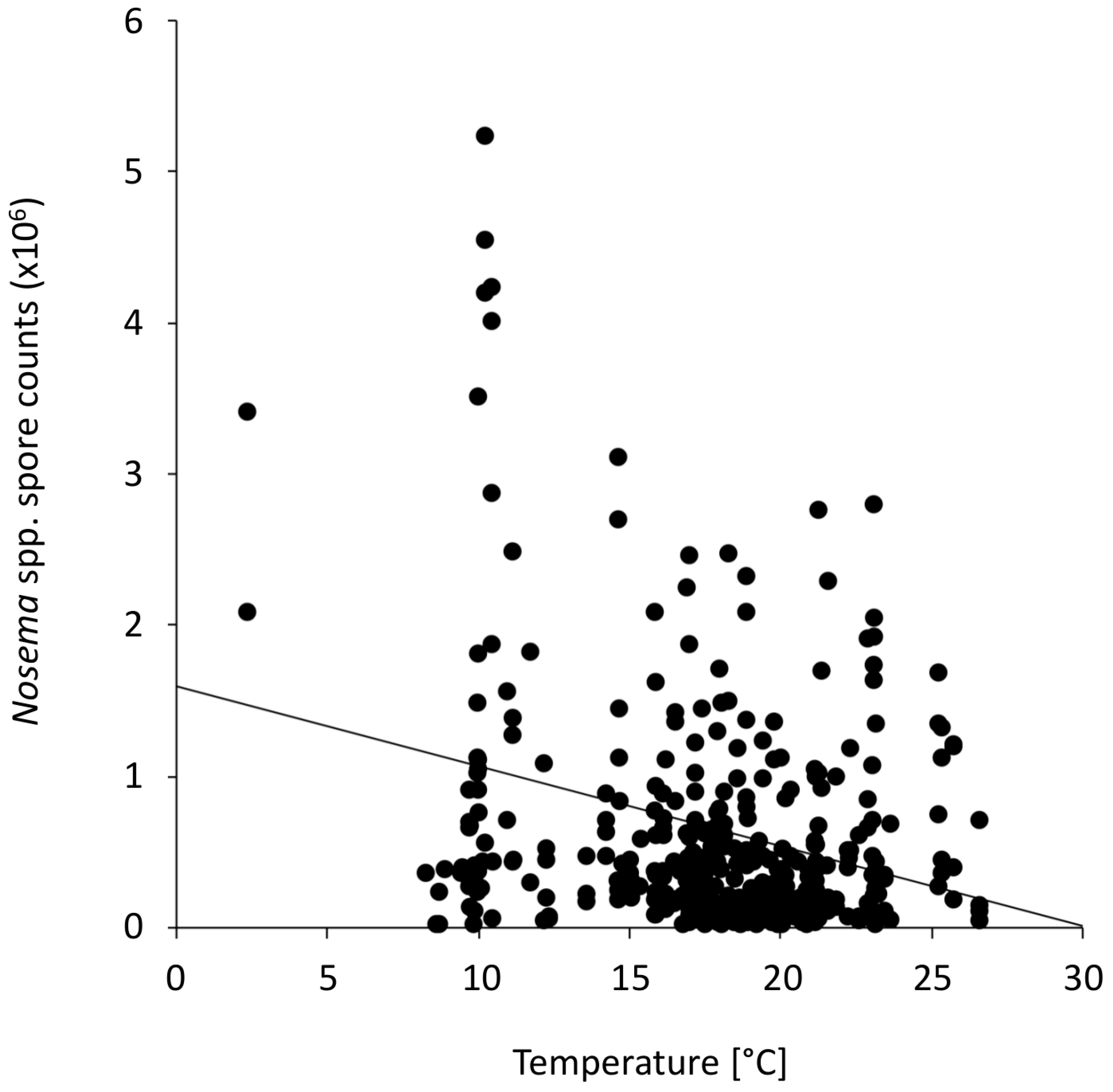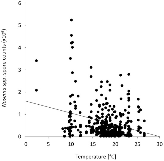 Nosema spp. intensities in the investigated honey bee colonies and the average monthly ambient apiary temperature. A significant negative correlation was found (N = 383, Spearman rank correlation, r = −0.1788, p = 0.0004). The association is displayed in a scatter plot with the data points (black points) and a trend line.