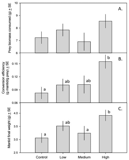 (A) Total prey biomass consumed by mantids fed zero, one, five, or 15 monarch caterpillars over a 35-day period ± SE; (B) Mantid trophic conversion efficiency (g mantid produced/g prey consumed) ± SE; (C) Final mantid weight (g) ± SE. Means with different letters are significantly different.
