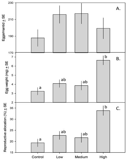 The 31 female mantids in this study produced a total of 6335 eggs. The MANCOVA revealed a significant effect of treatment on mantid fecundity (F9,51 = 3.53, p = 0.002). Although the number of eggs per mantid did not vary across treatments (Figure 2A; F3,23 = 1.49, p = 0.24), eggs of mantids in the high-toxicity treatment weighed more than those of mantids in the control treatment (Figure 2B; F3,23 = 3.44, p = 0.033). As a result, a larger fraction of mantid biomass was devoted to reproduction in the high-toxicity treatment than in the control (Figure 2C; F3,23 = 3.18, p = 0.042).