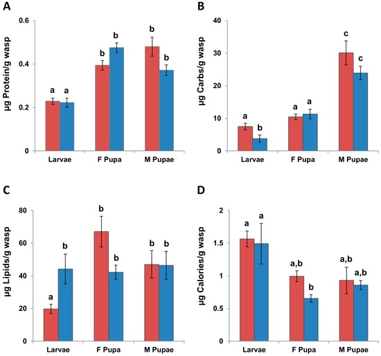 The mean levels of (A) protein; (B) carbohydrates; (C) lipids; and (D) calories per unit wet mass in fifth instar larvae (NG1 = 8, NG2 = 7), and male (NG1 = 7, NG2 = 4) and female (NG1 = 8, NG2 = 6) pupae of Trypoxylon lactitarse from the G1 (red) and G2 (blue) generations. Error bars indicate standard error. For each graph, different letters (a–c) indicate significant differences between groups (MANOVA followed by Tukey’s honest significant difference test (THSD)).