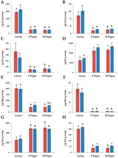 The mean levels of (A) Ca; (B) Cu; (C) Fe; (D) K; (E) Mg; (F) Mn; (G) Na; and (H) Zn per unit dry mass in fifth instar larvae (NG1 = 10, NG2 = 10), and male (NG1 = 4, NG2 = 6) and female (NG1 = 5, NG2 = 10) pupae of Trypoxylon lactitarse from the G1 and G2 generations. Error bars indicate standard error. For each graph, different letters (a–c) indicate significant differences between groups (MANOVA followed by THSD).