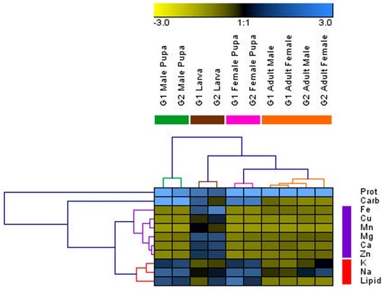 The meta-analyses (HCA and PCA) revealed several major changes in the nutritional profile of individuals during development. First, during pupation, there was a loss of most micronutrients, except for K and Na, relative to the amount that existed in the food. These nutrients may have been lost during the molting process, as the individuals retain their meconium until eclosion. Arthropods have been shown to use the molting process to remove certain metals [30,31]. The second emerging pattern was levels of K and Na seeming to correlate with the levels of lipids, which matches what was observed in the individual analyses. It is during the transition from pupa to adult that there was a reduction of carbohydrates and lipids. As both of these nutrients are involved in energy storage, the reduction is probably due to the metabolic needs of this metamorphosis.