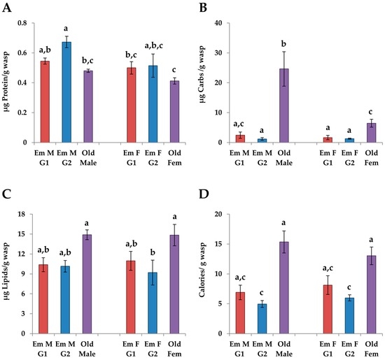 The mean levels of macronutrients: (A) protein; (B) carbohydrates; (C) lipids; and (D) calories per unit wet mass in eclosing males (NG1 = 6, NG2 = 4) and females (NG1 = 6, NG2 = 5) from the G1 and G2 generations and old adults (both generations combined, NMales = 8, NFemales = 10) of Trypoxylon lactitarse. Error bars indicate standard error. For each graph, different letters (a–c) indicate significant differences between groups (MANOVA followed by THSD).