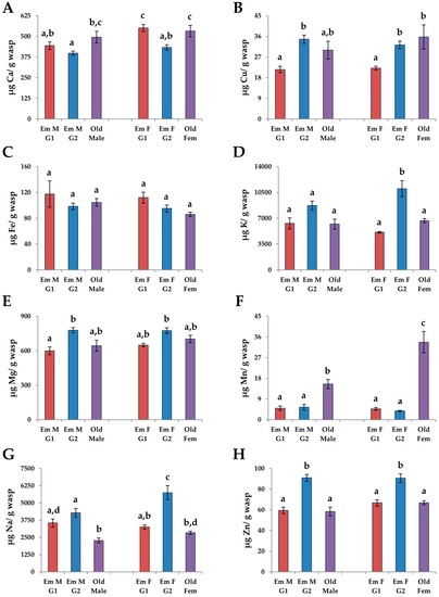 The mean levels of micronutrients: (A) Ca; (B) Cu; (C) Fe; (D) K; (E) Mg; (F) Mn; (G) Na; and (H) Zn per unit dry mass in eclosing males (NG1 = 9, NG2 = 17) and females (NG1 = 6, NG2 = 16) from the G1 and G2 generations and old adults (both generations combined, NMales = 5, NFemales = 6) of Trypoxylon lactitarse. Error bars indicate standard error. For each graph, different letters (a–c) indicate significant differences between groups (MANOVA followed by THSD).