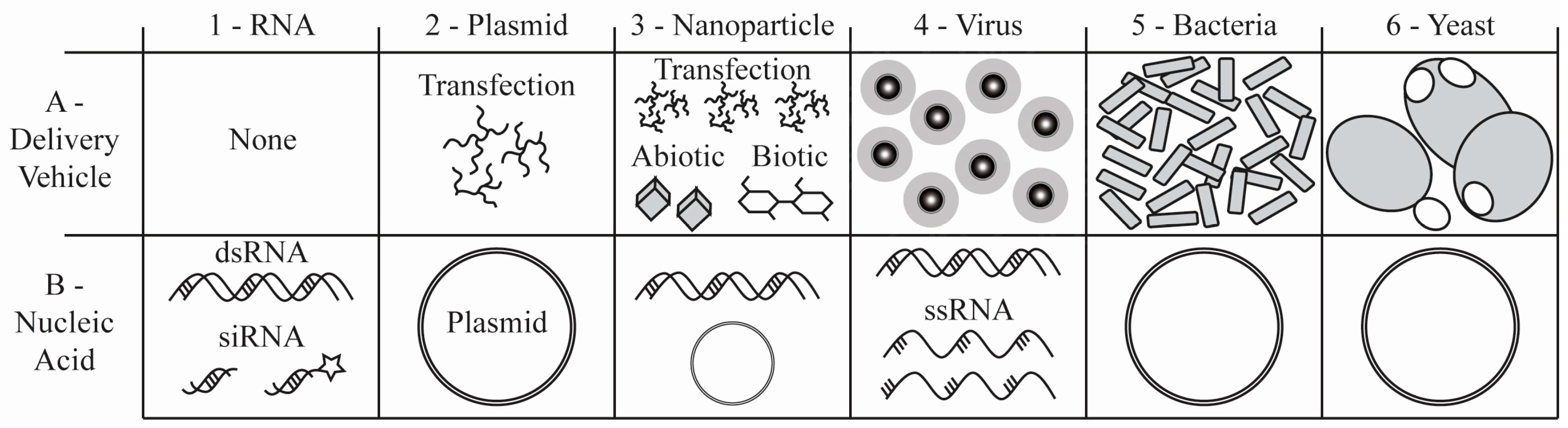 Plasmid expression systems offer major advantages over in vitro production of dsRNA. Firstly, expression of dsRNAs using bacterial systems have long been utilized to greatly reduce the cost of synthesis for nucleic acids and proteins. These plasmids contain a promoter followed by the target sequence of interest, a loop region, and the reverse complement of the sequence of interest, which when transcribed form a long hairpin dsRNA. Bacterial production of dsRNA still requires the dsRNA to be delivered to the mosquito following production, which has proven effective per os [13]. Alternatively, plasmids with insect specific promoters such as β-tubulin or actin 5C can facilitate production of the dsRNA within target cells of the mosquito [17,119,120,153,154,155,156]. Insect expression plasmids can also persist through multiple generations, with dsRNA production being inducible when using heat shock promoters [119,120]. The main drawback is delivery, since typically direct injection of embryos or adults is required to enable uptake into different tissues and bacterial expression systems release dsRNA into the gut. However, delivery of plasmids into insect cells by virtue of nanoparticle complexes using cell penetrating peptides has been demonstrated [157]. The next step will be to deliver stability expressed insect expression plasmids via a non-invasive route.