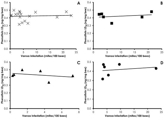 Varroa mite infestation affects physiological processes that are relevant to insecticide sensitivity. Varroa mite infestation can reduce body size [,], and body size is a universal factor that dictates sensitivity to insecticides. Varroa mites may affect insecticide sensitivity through lowering the titer of vitellogenin in the hemolymph of infested bees []. Vitellogenin is a carrier protein that can act to sequester xenobiotics and limit oxidative stress [], and high vitellogenin levels may account for the different acaricide sensitivities between workers and queens []. Varroa infestation dampens expression of genes involved in metabolic detoxification and oxidative stress []. Due to its effects on body size, vitellogenin titers, and metabolic gene expression, it is reasonable to conclude that Varroa mite infestation may increase insecticide sensitivity.