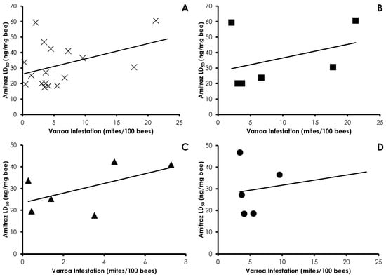 Influence of Varroa infestation on amitraz sensitivity in all treatments (A); Control (B); Amitraz (C); and IPM (D) treatment groups. There was no significant effect of Varroa infestation on amitraz sensitivity in any instance.