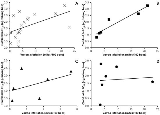 Influence of Varroa infestation on clothianidin sensitivity in all treatments (A); Control (B); Amitraz (C); and IPM (D) treatment groups. Clothianidin sensitivity significantly decreased with increasing mite infestation in all treatments and in the control group.