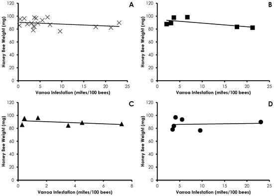 Influence of Varroa infestation on honey bee weight in all treatments (A); Control (B); Amitraz (C); and IPM (D) treatment groups. There was no significant effect of Varroa infestation on honey bee weight in any instance.
