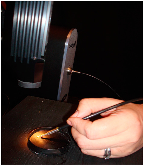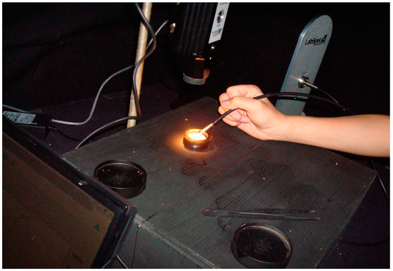 Once the insects reached second stadium, each treatment was removed once daily, beginning at approximately noon, from the chamber for measuring with an ASD (Analytical Spectral Devices™, Boulder, CO, USA) LabSpec 4 Spectrometer. The stage of development was noted daily based on the number of spiracular slits and crop size [46], and spectral measurements of 10 insects from each of the four treatments were completed daily until adult emergence. Those same larvae/pupae were measured again after washing with deionized water and filter paper and then blotting dry with filter paper in order to ensure that the measurements taken were of the insect and not from the feeding media on the insect surface. In order to keep the insects alive and not to affect reflectance measures, this is modified slightly from the suggested washing techniques of deionized water (tap water)/filter paper/freezing [47,48], deionized water/0.9% NaCl solution [47,49], and distilled water/methanol [49,50]. Excess water was removed with dry filter paper from the insect surface because water exhibits specular reflections and could be misleading to the spectral signature [51].