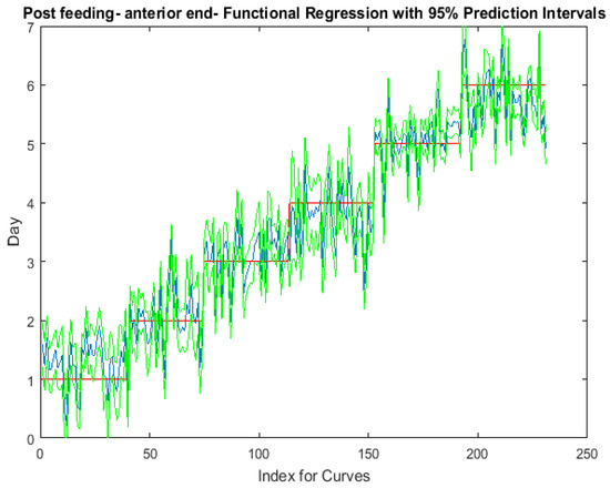 The functional regressions for each model based on the post-feeding stage of the washed larvae indicate that each of the models from all three measured regions are a good predictor of day within the post-feeding stage (Figure 3, Figure 4 and Figure 5). The spectral measurements from the posterior region of the larvae provide a superior prediction, compared with the anterior and midsection measurements.