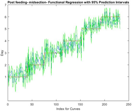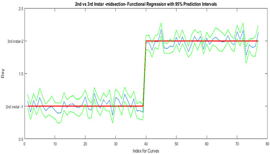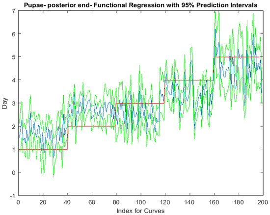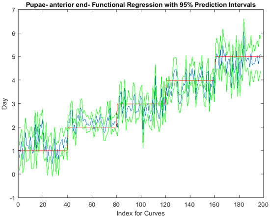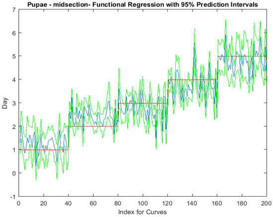 The functional regression with 95% upper and lower limit pointwise prediction intervals (green) for spectral measurements from 350 to 2500 nm of the anterior end of Lucilia sericata pupae raised at a mean temperature of 23.9 °C. The predicted days appear in blue and the red line is the actual day.