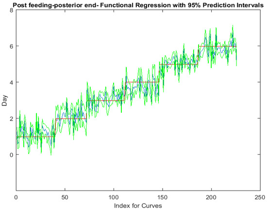 The functional regression with 95% upper and lower limit pointwise prediction intervals (green) for spectral measurements from 350 to 2500 nm of the posterior end of Lucilia sericata pupae raised at a mean temperature of 23.9 °C. The predicted days appear in blue and the red line is the actual day.