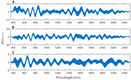 The contributing β(w)washed coefficients of the spectral measurements for each of the measured regions ((A) anterior end, (B) midsection, and (C) posterior end) of Lucilia sericata post-feeding larvae raised at a mean temperature of 23.9 °C.