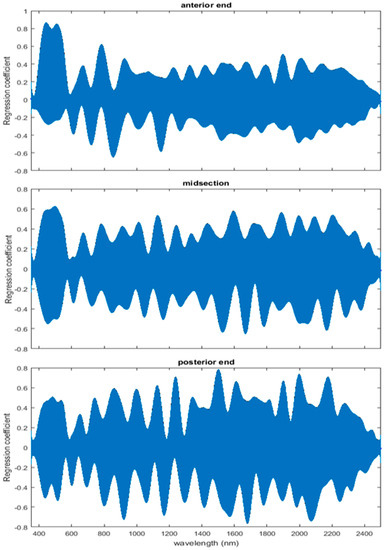 Differences were found in the daily spectral signatures of the post-feeding stage of L. sericata. The posterior spectral measurements surpassed the anterior and midsection measurements for prediction of day in the post-feeding stage. There were different contributing wavelengths and coefficients for the different regions of the insect (Figure 6). The posterior end had the most contributing wavelengths to the model. In fact, while measuring, it was noted that daily changes were visible in the posterior spectral measurements before they were visible in the midsection and anterior measurements. The position of oenocytes probably indirectly explains most of these findings. They are regularly found in the insect abdominal integument proximal to the spiracles [53]. Oenocytes produce cuticular hydrocarbons, which are then transported to the remainder of the cuticle and fat body by lipophorin in the hemolymph [54]. Cuticular hydrocarbons waterproof the insect and contribute to the near infrared (NIR) and shortwave infrared (SWIR) spectral measurements of the insect surface [55]. They also have been found to vary in necrophagous insects within larval stages [27,29,30,31]. Since the location of the oenocytes are most probably in the abdomen, cuticular hydrocarbons are probably identified earlier and of a stronger concentration than they are at the further away body regions of the anterior end and midsection. Besides hydrocarbons, color or opaqueness, surface texture, tracheal changes near to the light penetrable surface, mouthpart and spiracular changes all may contribute in some form to the spectral measurements.