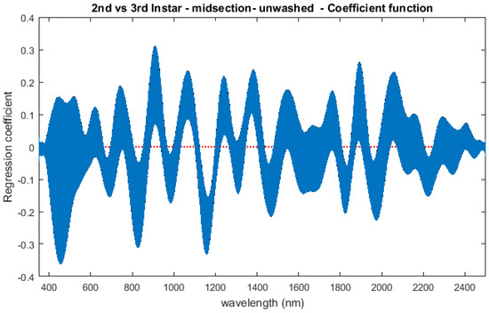The second and third instar Lucilia sericata (raised at a mean temperature of 23.9 °C) function of the unwashed coefficients with 95% confidence bands for the midsection spectral measurements (350–2500 nm). The contributing wavelengths are indicated by the dotted red zero line.
