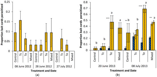 Trichogramma activity assessed as mean proportion (±SE) of bait cards being parasitized with Trichogramma evanescens (orange and dotted), T. cacoeciae (blue and hatched) and the total proportion bait cards being parasitized (purple) in a completely randomized block experiment with three treatments; mass release using Trichocards® of T. evanescens (Te), T. cacoeciae (Tc), a mix of the two species (Mixed) and a control in (a) 2012, where only T. evanescens emerged and no significant differences were found between treatments; (b) in 2013 where both species emerged. Letters indicate significant differences between total proportion bait cards parasitized based on pairwise comparisons of ls-means. Asterisks indicate significant differences (Chi-square test, * p <0.05, ** p <0.01, *** p <0.001) between proportion cards found by the two species within a treatment.