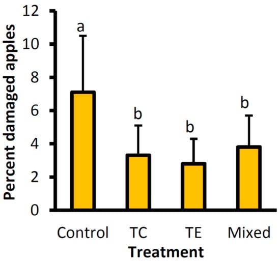 The effect of treatment on fruit damage was significant (F3,27 = 3.55, p = 0.028), with a higher percent of damaged apples in the control (7.1% ± 3.4%) than in Trichogramma treatments (T. evanescens (2.8% ± 1.5%) (t = −2.73, df = 27, p = 0.01), mixed (3.8% ± 1.9%) (t = −2.12, df = 27, p = 0.04), and T. cacoeciae (3.3% ± 1.8%) (t = 2.32, df = 27, p = 0.03)) (Figure 2). Fruit damage was significantly higher in 2013 (5.7% ± 2.7%) than in 2012 (2.8% ± 1.4%) (F1,27 = 7.66, p = 0.010), but there was no interaction effect between the damage and year.