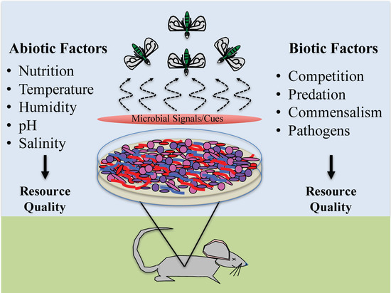 Researchers are still describing microbial communities associated with decomposing remains and, in most cases, descriptions and cataloging are restricted to bacteria [45,46,47,48,49]. Who is present and how these communities differ across resources are still not fully known, which presents wonderful opportunities for exploratory research and applications in insect behavior and ecology as related to forensics. Many of the currently published forensically-relevant studies of microbial communities are predominately hypothesis driven, examining the impact of abiotic and biotic factors potentially influencing microbial composition. The purpose of this paper is to present a different perspective of the decomposition process and provide some basic understanding of some, but certainly not all, factors impacting microbial activity which, in turn, likely impacts arthropod behavior (Figure 1). Though many of these factors are known, especially to microbiologists, we hope that this paper will provide concepts of the regulation of microbe-insect interactions, in order to further guide considerations of such forensically-relevant evidence.