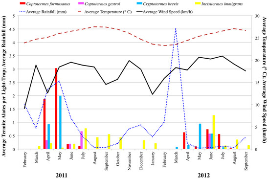 Termite alate species occurrences were mapped using ArcGIS 10.1 [40]. The total number of termite alates per week for all locations was divided by the total number of light-traps out per week and averaged by month, then graphed with average temperature, rainfall, and wind speed [41].