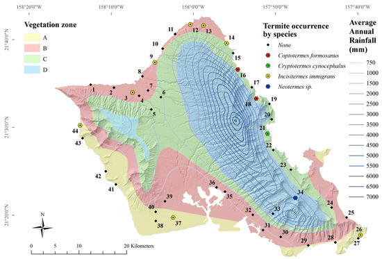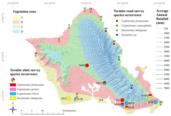 Termites were identified based on the soldier or reproductive caste using a variety of resources [15,16,23,38]. A mandibular comparison with known species was used for a site where only drywood termite nymphs were found. Termite occurrences were mapped using ArcMap 10.1 [40]. Abiotic factors (elevation, average annual rainfall, vegetation zone, and physiographic (windward/leeward) zone) from a variety of sources [9,44,45,47] were spatially joined to site point data using ArcMap 10.1 [40]. Termite alate occurrences were compared with hand-collection survey occurrences. A generalized linear model (binomial, logit link) using JMP [42] was performed on the presence or absence of I. immigrans with elevation and average annual rainfall, since it was the only species found at more than two sites.