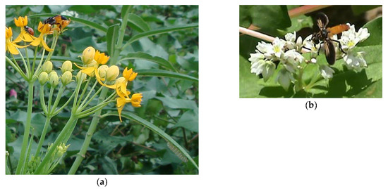 Milkweed nectar is very rich in sugar, and the supply is renewed over the life of the individual flower [64,65]. The flowers of milkweed species are attractive to butterflies, bees, and other insect pollinators, as well as hummingbirds, and they provide a rich supply of nectar to these pollinator species [66,67]. Thus, tropical milkweed, Asclepias curassavica L., was placed in a corn-peanut-cotton farmscape to examine attractiveness and nectar-feeding of stink bug parasitoids and other insects in the field [68]. Each week throughout the growing season, every plant was observed for 2 min. on an hourly basis throughout the day. Although flowers are generally selected to benefit parasitoids, and not pests of the crop, flower morphology has been recognized as an important factor impacting accessibility of nectar to parasitoids, and thus should be taken into account [3]. Stink bug adult parasitoids, including T. pennipes, C. binotata, E. tentatrix; and egg parasitoids, T. basalis and T. podisi, though, regularly visited tropical milkweed and fed on its nectar (Figure 1a). Pollinators, including honey bees, Apis mellifera L., native insect pollinators, i.e., free-living flies and wasps and native bees, and parasitoids of lepidopteran pests, such as Toxoneuron nigriceps (Viereck) (Hymenoptera: Braconidae), also fed on tropical milkweed nectar. The monarch butterfly, Danaus plexippus (L.), of North America is renowned for its long-distance seasonal migration and its spectacular winter gatherings in Mexico and California. Monarch larvae feed exclusively on milkweeds in North America [69] (Figure 1a). In Georgia farmscapes, adult monarch butterflies fed on tropical milkweed nectar, and monarch larvae feeding on milkweed vegetation successfully developed into pupae [68].