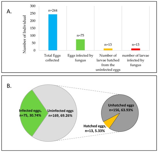 Number of infected eggs and larvae in contrast with the total number of eggs and larvae hatched from the eggs. (A) Total of 244 eggs were collected from 40 different matings, representing 120 males and 80 females in individual petri dish in 3:2 ratio. There were 75 eggs infected by fungi and 13 larvae hatched from 169 uninfected eggs; (B) The fungus infection rate was 30.74%, while the hatching rate of the uninfected eggs was 5.33%.