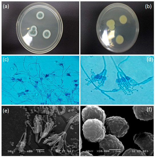 (a) Colony surface on PDA media (seven days, 26.8 °C); (b) Reverse colony in PDA (seven days, 26.8 °C); (c) Hyaline hyphae with smooth-walled conidiophore stripes in 100–300 µm (magnification 400×); (d) Conidiophores seen from which extend the metulae and conidia producing phialides; Metulae being substantially longer than the phialides; Metulae are 12–15 µm in length which are found in whorls of 3–5 divergent structures (Magnification 1000×); (e) Conidia are globose (round) to sub-globose (with a slightly off-round shape) and present in well-defined chains (Scanning Electron Miscoscope image); (f) Conidia (approximately 1.8–2.2 µm measured in diameter) are globose to sub-globose and have finely roughened surface (SEM image).
