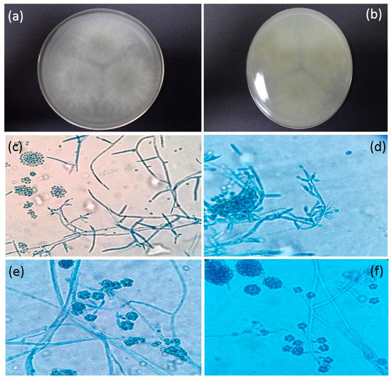(a) Colony surface on PDA media (five days, 26.8 °C); (b) Reverse Colony on PDA media (five days, 26.8 °C); (c) Septate, Hyaline hyphae with Conidiophores branching at wide angles (near right angle) while some conidia clump together (Magnification 1000×); (d) Phialides in flask or ampule shape while some with single conidia are attached to the tips (Magnification 1000×); (e) Conidia clustered around tips of the phialides (Magnification 1000×); (f) Conidiophores branching at near right angles (Magnification 1000×).