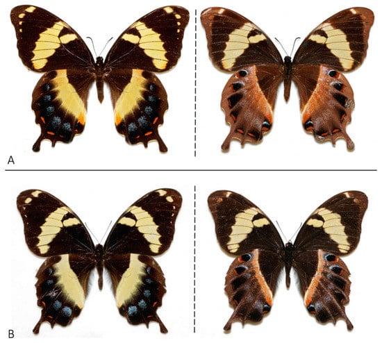 Papilio homerus is the largest species in the genus with a forewing length that averages 75 mm [5,6], and some reported female specimens have a forewing length of 90 mm [27]. The sexes of P. homerus are similar in coloration and pattern and the females are larger in size [5,6] (Figure 4). The dorsal surface of the forewing and hindwing has a base color of dark brown to blackish with a broad, yellow discal band extending across both wings. The hindwing has powdery-blue postdiscal spots and brick-red submarginal lunules and large spatulate tails (Figure 1). The ventral surface of the wings also has a dark brown-black base color, but the yellow discal band is narrower with sporadic blue scales [6,10].