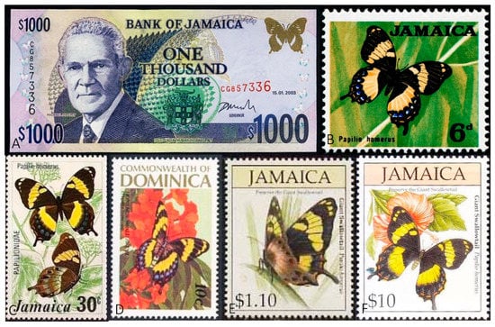 Printings and postage stamps of Papilio homerus that contribute to its status as a flagship species. (A) The Jamaican $1000 bill features P. homerus in the upper-right corner. Representative stamps issued in 1964 (B), 1975 (C), 1989 (D), and 1994 (E,F) that feature P. homerus.