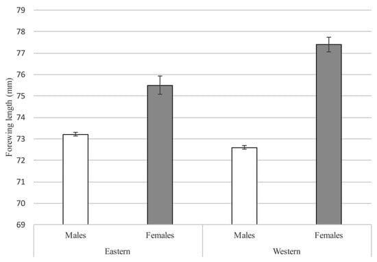 Forewing length measurements (mean ± SE) of Papilio homerus collected from the eastern and western populations. Females of P. homerus from the eastern population (n = 2) had significantly larger forewing lengths than males (n = 19) (p = 0.03). A similar pattern is shown with P. homerus collected from the western population, where females (n = 5) had significantly larger forewing lengths than males (n = 15) (p = 0.02). In general, females are significantly larger than males (n = 8, 34, respectively; p = 0.04), similar to previous reports [4,6,7]. There were no significant differences in forewing length measurements in males or females between populations (p ≥ 0.05). All individuals measured from the eastern population and two males from the western population were acquired from the Carnegie Museum of Natural History (Pittsburgh, PA) collection. The remaining individuals measured from the western population are reported by Lehnert (2008). A two-sample unequal variance t-test was used to test for significant differences (p < 0.05). Although no significant differences were found within sexes between populations, we suggest a future and more rigorous morphometric analysis is needed to compare populations, which would include a larger sample size, additional wing measurements, and details about the genitalia.