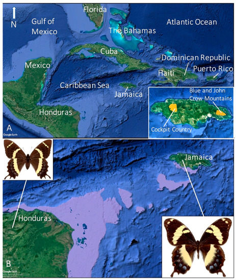 Maps of Central America and the Caribbean showing the distribution of Papilio homerus. (A) Map showing the location of Jamaica relative to the other Caribbean islands and Central America. The inset (bottom right) shows the range of the extant P. homerus populations (yellow) in the Cockpit Country and the Blue and John Crow Mountains, Jamaica. (B) Papilio garamas (from Honduras and other regions of Central America, top left image) and P. homerus (only found in Jamaica, bottom right) putatively share a recent common ancestor. Fluctuations in the sea level might have extended the mainland of Central America and created islands in the past (areas shown in purple) that would have acted as stepping stones for the common ancestors of P. garamas and P. homerus to move to Jamaica and speciate. Shown here is a female of P. garamas electryon Bates 1864 captured from El Salvador in 1969. All maps were acquired from Google Earth®.