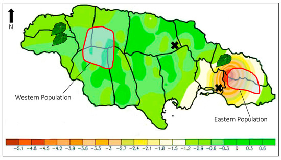 Based on reported sightings and collected individuals, P. homerus inhabited seven of Jamaica’s 14 parishes and were clustered into three groupings: the central, eastern, and western populations (Figure 5A) [5]. The central population was located near Mt. Diablo, the eastern population is located at the junction of the John Crow and Blue Mountain ranges, and the western population is in the Cockpit Country [4]. The interpopulation dynamics are unknown and individuals of P. homerus have not been collected between these populations, which suggests that the central population was a true population, i.e., individuals collected there were not strays from the peripheral populations.