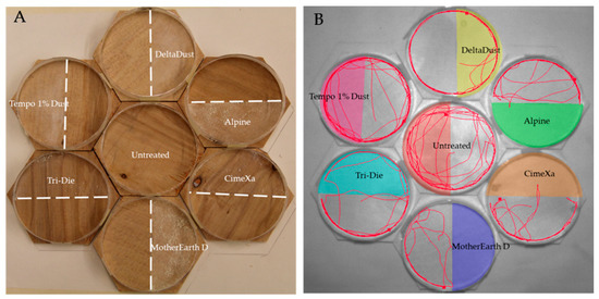View of experimental arenas: (A) Plywood hexagons included halves treated with insecticide dusts. An untreated hexagon was always included in each replicate to act as control; (B) The activity of individual insects in each hexagon was tracked with EthoVision® XT software to generate behavioral parameters (tracks of individual bed bugs during 5-min recordings).