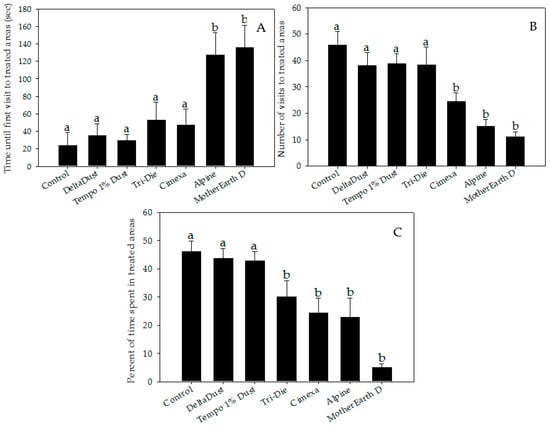 Behavior parameter measurements of bed bugs interacting with areas treated with insecticide dusts during 5-min recordings: (A) elapsed time until first visit; (B) number of visits; and (C) percent of time spent. Data are presented as means ± SE. Bars that have the same letter as the control indicate that there is no significant statistical difference between the given dust treatment and control arena (One-way ANOVA, Dunnett’s test, p > 0.05; Mann–Whitney W test, p > 0.05).