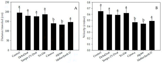 Locomotor parameter measurements of bed bugs in areas treated with insecticide dusts: (A) distance traveled and (B) velocity. Data are presented as means ± SE. Bars that have the same letter as the control indicate that there is no significant statistical difference between the given dust treatment and control arena (One-way ANOVA, Dunnett’s test, p > 0.05).