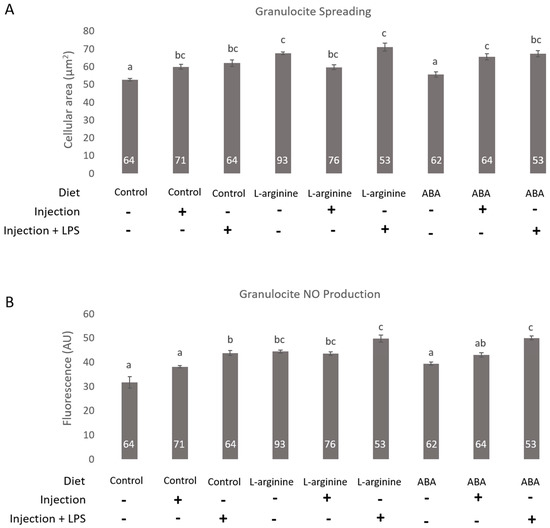The effects of l-Arginine and ABA dietary supplementation over granulocyte spreading and NO production were evaluated in response to LPS-injected in in vitro-reared A. mellifera larvae.