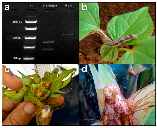 (a) Partial Cytochrome c oxidase subunit I (COI, 511 bp) RFLP pattern (digested with BstZ17I) of Helicoverpa armigera and Helicoverpa zea, with bands separated on 2% agarose Gel. M = DNA ladder; (b–d) Helicoverpa larvae were found attacking leaves and pods in (b) soybean; (c) leaves, flowers and bulbs in cotton; and (d) maize ears. In soybean and cotton crops, only H. armigera was found, but in maize both Helicoverpa species were found, indicating possibilities of hybridization. For cotton and soybean, H. armigera was also found in Bt crops.