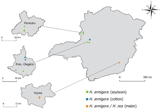 Sampling sites in the State of Minas Gerais where Helicoverpa armigera and Helicoverpa zea were collected in the study. The ten samplings sites were focused in three municipalities (Highlighted maps: Paracatu, Presidente Olegário and Viçosa). Individuals of H. armigera were found in six soybean (green circles) and two cotton (blue circles) sampling sites, including Bt and Non-Bt crops. Mixed infestations between H. armigera and H. zea were found in two sampling sites with non-Bt maize crop (orange circles).