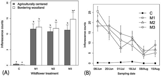 Mean (+1 SE) observations of (A) inflorescences among the mixes in relation to local spatial context, and (B) across time. Legend labels: C—control, M1—floral mix, M2—floral mix, and M3—floral mix; Table S1). Lowercase letters in panel (A) represent adjusted linear comparisons α = 0.05, where all wildflower treatments (M1, M2, M3) were significantly different from the control (C), and there was a tendency for there to be more flowers in plots adjacent to woodlands for M3 (indicated by bc *).