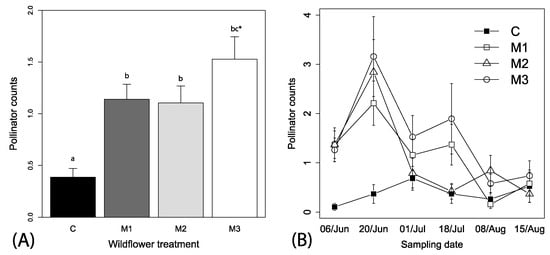 Mean (+1 SE) observations of (A) pollinators among the mixes and (B) mean (±1 SE) pollinators across the time among the different wildflower treatments. Wildflower treatments represent same as Figure 1; Table S1). Lowercase letters in panel (A) represent adjusted linear contrasts at α = 0.05.